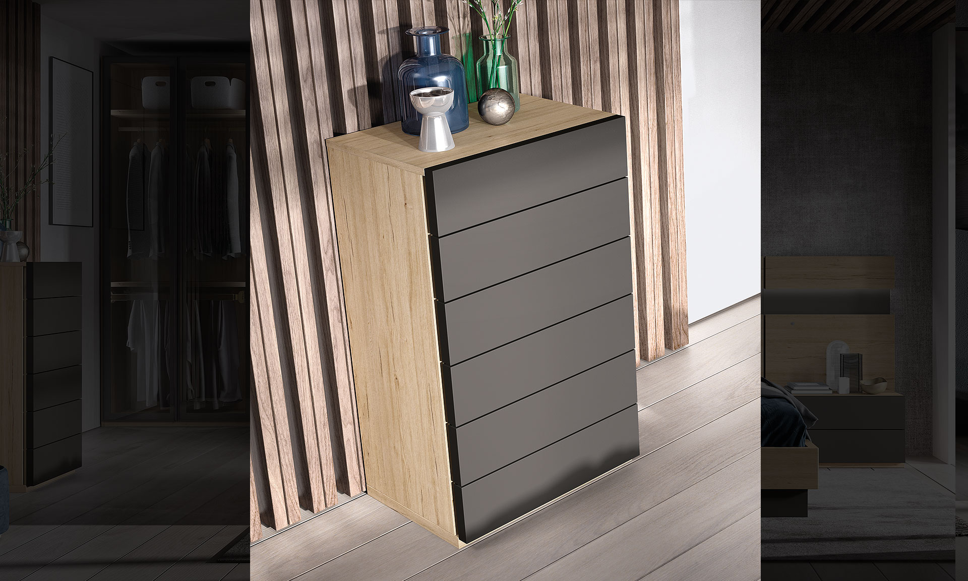 Lits, chevets, meubles de complément disponibles.